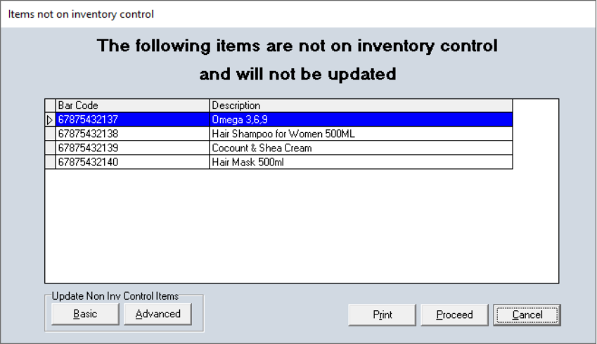 The 'Update Non Inv Control Items' section has been added to the 'Items not on inventory control' window of the Inventory Counting application, including two new buttons – Basic and Advanced.