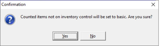 If either is selected, a confirmation message will display to warn the user of the selected option. If ‘Yes’ is selected - The inventory control status of the items listed in the ‘Item not on inventory control’ window will be updated. If ‘No’ is selected, then it will return to the previous screen.