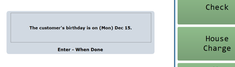 The screenshot below shows the prompt that shows on the till screen. This gives the clerk the option of wishing the customer a happy birthday.